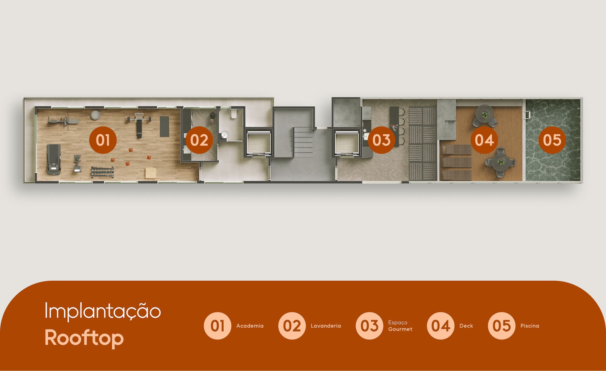 Rooftop com piscina, espaço gourmet e academia.